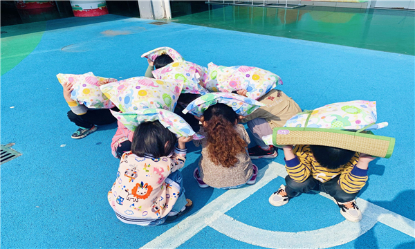 紧接着演练程序启动了,老师播放地震信号表示地震已经发生了。老师大声的告诉幼儿:“地震来了不要慌张用小枕头护住我们的头部男生一队女生一队不拥挤有秩序逃离到空旷的操场上面去。”逃离的过程中老师始终关注幼儿的安全,等到空旷的操场上立即清点幼儿人数和检查幼儿是否全部安全,全部无误本次防震减灾才顺利完成。